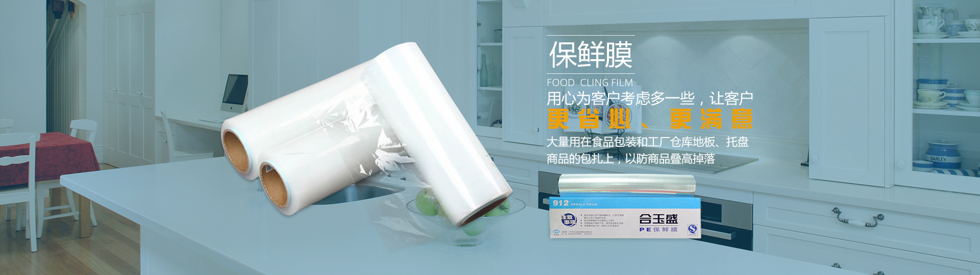合玉盛公司篩選進口原料及配方,通過流延機共擠工藝生產具有“易撕斷”、“有韌性”、“黏性好”、“清晰度高”等特性的食品級pe保鮮膜,廣泛用在各星級酒店、飯館、食肆店、鐵路、航空食品,化妝品行業,遠銷國內外市場。